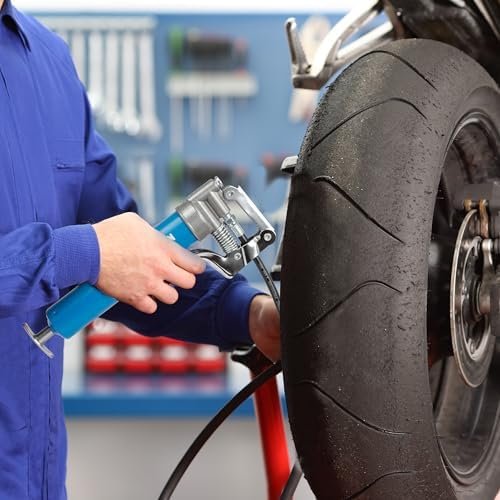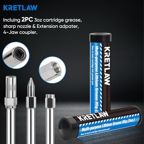 UPDATED GREASE GUN SET: KRETLAW grease gun set is equipped with more practical tool, one small grease Gun (3000PSI), 2pc 3OZ grease cartridges,1pc long extension pipe, 1PC 12″ spring flex hose, 1pc 4-Jaw couplers, 1pc Sharp Nozzle, 1pc extension adapter, , a pair of reinforced PVC gloves. VERSATILE NOZZLES: The KRETLAW grease gun set boasts three diverse nozzles, seamlessly accommodating a wide range of applications from vehicles, tractors, RVs, to automobiles, PTO axles, steering cylinders, universal joints, suspension components, ball joints, lawn mowers, chassis, and driveshafts. DURABLE & REINFORCED GREARSE GUN: Crafted from premium, heavy-duty die-cast aluminum, the pistol grip grease gun ensures a robust construction capable of withstanding a maximum working pressure of 3000 PSI, ensuring leak-proof performance and longevity. EFFORTLESS GREASE DESIGN:Experience seamless grease dispensing with the combination of a robust T-handle pull rod, a powerful spring, and a high-pressure plunger O-ring, delivering ultra-smooth grease injection for effortless and efficient operation. ANTI-SLIP HANDLE: the ergonomic handle, featuring an anti-slip texture, allows for a comfortable, swift, and controlled squeeze every time.