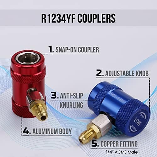 CAR QUICK ADAPTER KIT: R-1234YF adapters with 1234yf can tap valve kit ideal for connecting with basic or advanced manifold gauges and serving on automotive air conditioner refrigerant recharge work AC GAUGE ADAPTER SET: Come with pair of high and low pressure Quick Couplers – 1/4 inch male fitting, self-sealing Can Tap Valve – 1/4 inch male fitting, Tank Adapter, dual head valve core remover HEAVY-DUTY MATERIALS: Made of copper, aluminum and steel materials for long lasting, featuring H/L temperature resistance and corrosion resistance, will stand heavy use in garage EASY OPERATION: Constructed with accurate snap lock and knurled grip ring for easy operation, removable pure copper adapter with oring seals for longer maintenance NO LEAKAGE DESIGN: All connection parts adopt precise fine thread design, and the interface is also equipped with high-quality thick rubber seals to ensure safety
